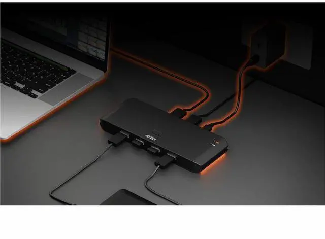 Share 4 USB Peripherals between 2 PCs with One-Button Switching | Instantly Manage Four Peripherals with a Single PressThe US4224 is a 2-Port USB Sharing Switch tailored for professional and personal workspaces where peripheral sharing between computers is essential. Featuring InstaSync™, you can easily switch control of up to four USB peripherals between two computer systems in an instant. This ensures a quick, streamlined workflow for any task while keeping your workstation tidy, clutter-free, and manageable at all times. Sleek | Compact | Portable | Accent LightStay in Sync with a Stylish GlowShare All Devices with One-Button Switch | Flexible Bus-Powered DesignThe switch automatically powers on when connected to a computer.