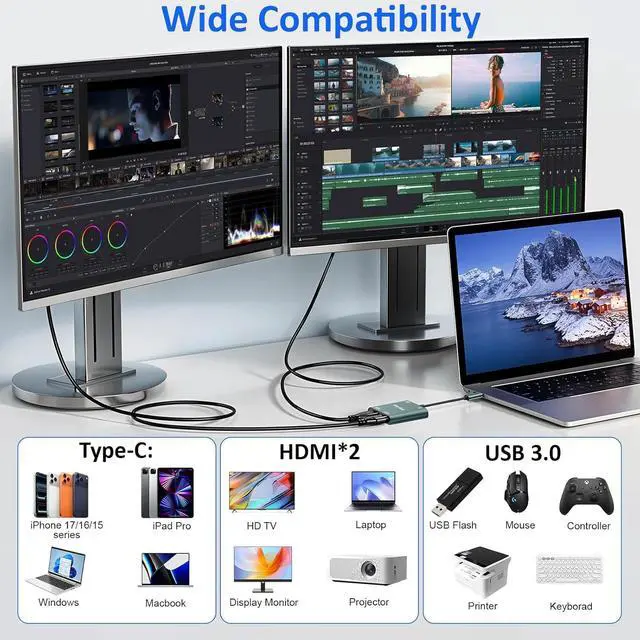 Multifunctional 4-in-1 USB C Hub- Herfair USBC hub offers seamless connectivity with 2 HDMI ports up to 4K@30Hz a USB A 3.0 (5Gbps) port for fast data transfer and a powerful 100W PD charging port all in one compact device. Stunning Dual HDMI Display- Herfair USB C to dual hdmi adapter supports both HDMI ports to be used at the same time supports up to 4K@30Hz resolution when using one alone and dual 1080P@60Hz when using both.???????????????????????????????????????????????????????????????????????????????????????????????????? (???????????????????????????????????????????????????????????????? )