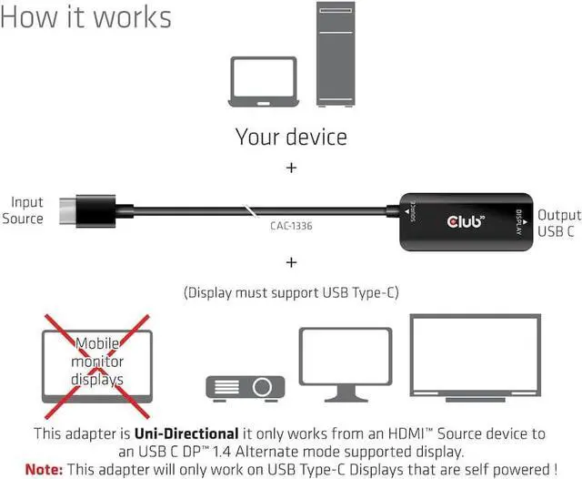 THIS adapter is NOT bi-directional. It only converts signal from HDMI to USB type C, The USB power should be connected to power before connecting the adapter to a monitor, Support Hot-Plug Detect This adapter will function with lower specifications GPUs, be aware performance will be reduced due to the specifications of that GPU !! MUST, when you connect the adapter with an USB type C M-M cable, please make sure the cable support USB type C altmode 1.4 , 4K 120Hz specification.