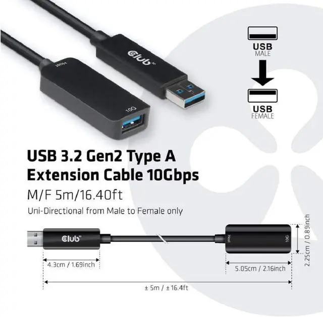 The Club 3D CAC-1411 is a USB type A extension cable for extending and improving the USB signal up to 5 m. It is compatible with USB 3.2 Gen 2 with a maximum data transfer of 10 Gbps. Backward compatible with lower versions. Please note that the technical data do so may be limited to the connected device.