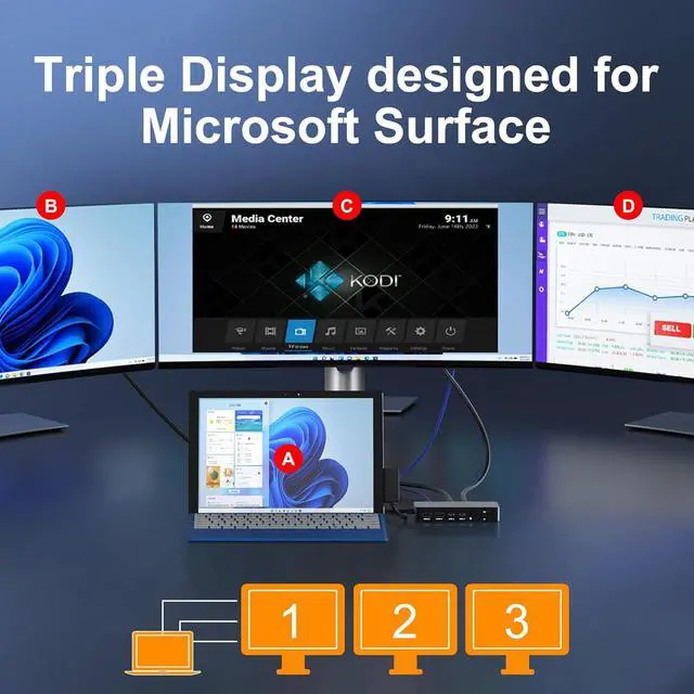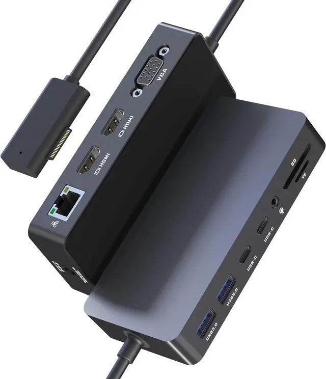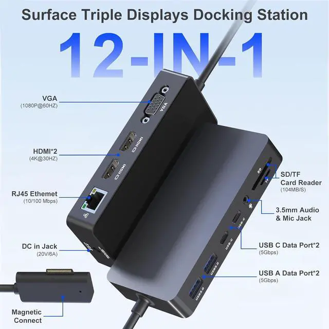12-in-1 Surface Docking Station: Your All-in-One Surface DockTransform your Surface into a powerhouse workstation with our versatile 12-in-1 Surface Dock. This Surface Pro 11 dock consolidates all your needs: dual 4K HDMI and a VGA port for triple-screen setups, 2x USB-A 3.0 and 2x USB-C ports for 5Gbps data transfer, SD/TF card slots supporting up to 2TB, a 100Mbps RJ45 Ethernet port, and a 3.5mm audio jack. The included 72W DC power port ensures your device stays charged. Experience seamless, plug-and-play connectivity designed for Microsoft Surface Pro, Surface Book/Go/Laptop GO, and Surface Laptop.