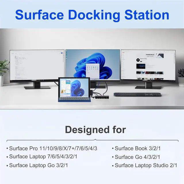 Universal Compatibility with Plug & Play EaseDesigned for a seamless setup, our Surface docking station offers broad, plug-and-play compatibility with no drivers required. It works effortlessly with: Microsoft Surface Pro 11/10/9/8/7/6/5/4/3, Surface Laptop 7/6/5/4/3/2/1, Surface Go 4/3/2/1, Surface Laptop Go 3/2/1, Surface Laptop Studio 2/1, and Surface Book 3/2/1. This Surface laptop docking station is engineered to simplify your workspace and expand your device's capabilities instantly.