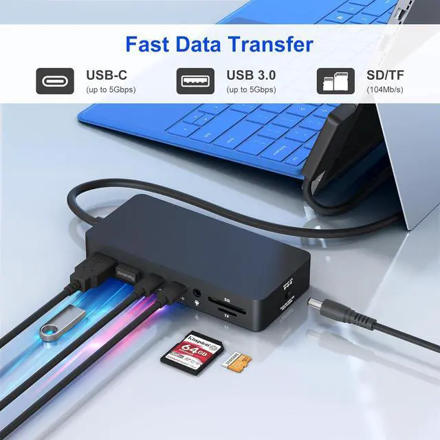 High-Speed Data Transfer & SD/TF Card ReaderEquipped with 2 USB 3.0 ports and 2 USB-C ports (each with up to 5Gbps speed), this Surface Pro dock lets you transfer files from external drives in seconds. The dedicated SD and TF card slots further enhance workflow efficiency, allowing photographers and creators to directly access photos and videos from camera cards at speeds up to 104MB/sno extra adapters needed.
