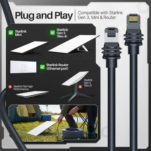 Simple Plug-and-Play Setup: Purpose-built replacement cable for Starlink Gen 3 and Mini installs without crimping tools or manual wiring. Run the line along walls, under eaves, or across attics, then plug into your Starlink dish and router ports for quick, secure installation