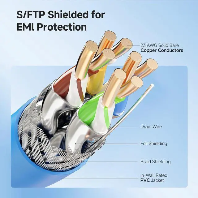 Superior Shielded Construction: Built with solid copper conductors and foil shielding around each twisted pair, plus a braided screen under the jacket, this Cat 6A cable delivers maximum EMI/RFI protection and reduces alien crosstalk (AXT) for dependable signal quality.