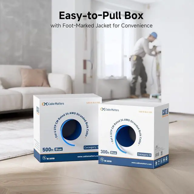 10-Gigabit Ethernet Compatibility: This future-proof Cat6 300ft cable ensures your network is ready for 10-Gigabit Ethernet, while also being backward compatible with Fast Ethernet and Gigabit Ethernet. The foot-marked jacket helps you easily track the amount of cable left in the easy-to-pull, dispenser frame box