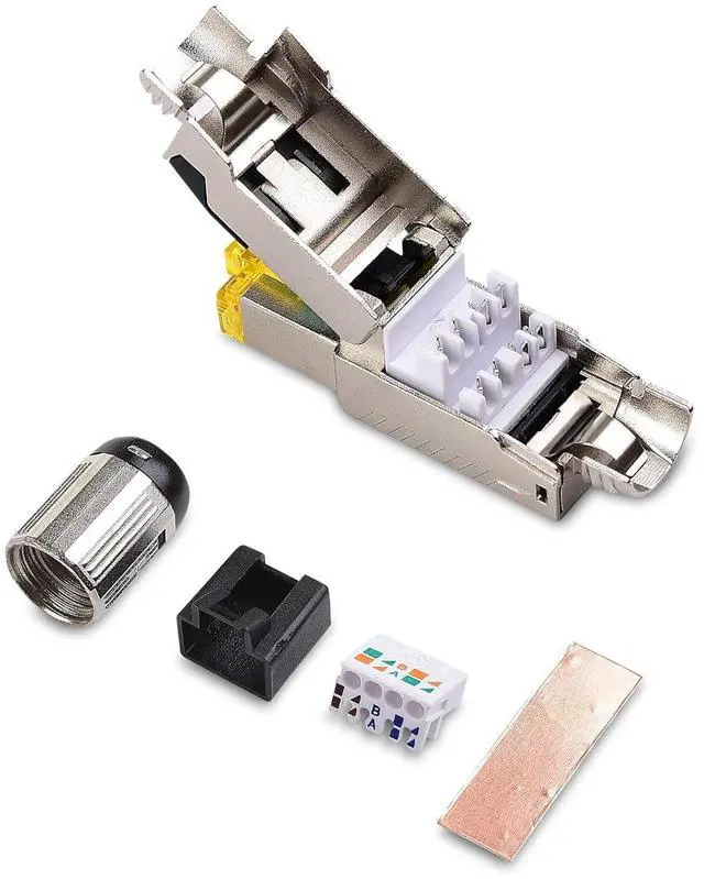 This fully shielded field termination plug is designed for sensitive environments that demand security with protection against EMI/RFIelectromagnetic noise andalien crosstalk. A rugged metal construction with an integrated silencing cylinder and a screw-on metal strain relief boot provides superior Cat 8 performance up to 40 Gigabit.