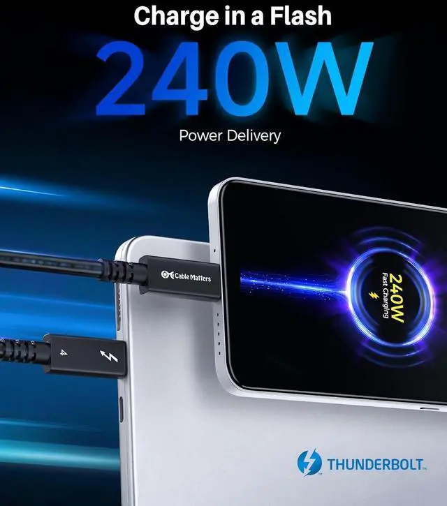 Leading-Edge Thunderbolt 4 Cable: Experience cutting-edge connectivity with the Cable Matters Active Thunderbolt 4 Cable, the longest active cable on the market supporting both Thunderbolt 4 and USB 4 standards. This long Thunderbolt 4 cable offers exceptional 40Gbps data transfer and 240W charging.