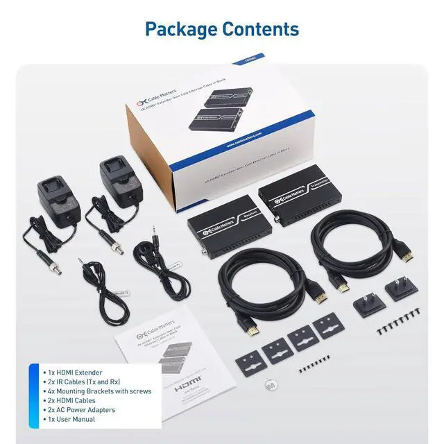 Control a DVD player or other HDMI video source from a remote location with the included IR cables that forward commands over a dedicated DDC channel for convenience and security; The HDMI over Cat6 extender comes with bonus 2-Pack of High Speed HDMI cables