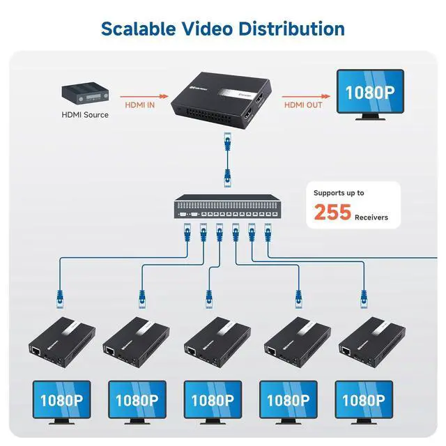 Extended Range HDMI Solution: Extend HDMI audio/video up to 492 feet using a single Cat6 cable with this HDMI to Ethernet adapter converter. Ideal for connecting a computer, Blu-ray player, or console to an HDTV or projector, this solution simplifies long-distance setups.