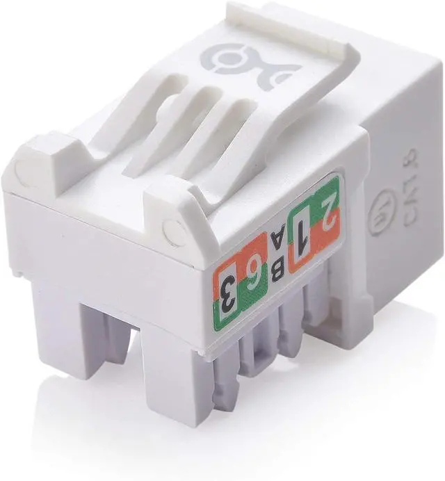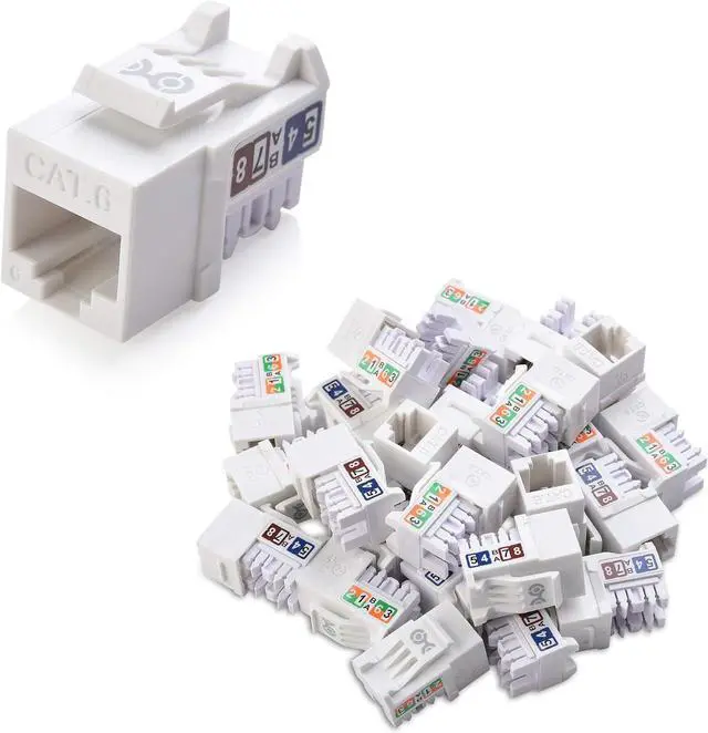 Bundled 25 pack of slim profile Cat6 RJ45 keystone jacks support the expansion of your network; 10 Gigabit keystone jacks support network speeds of up to 10Gbps with compatible cables; Easy installation of the 90 degree easy termination RJ45 jack, which fits both the bundled keystone patch panel, or standard or slim keystone blank openings on wall plates or surface mount boxes