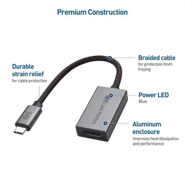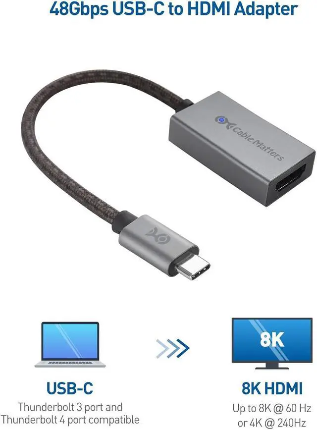 Compact USB C 8K HDMI 2.1 Adapter: Upgrade to HDMI 2.1 or future-proof your setup with the Cable Matters USB C to HDMI 2.1 Adapter; HDMI to USB C cable adapter combines the latest HDMI 2.1 standard with the versatility of USB-C; The HDMI USB C adapter (USB C adapter to HDMI) supports up to 8K 60Hz resolution on compatible displays and devices; HDMI to Type C adapter is perfect for ultra high resolution displays