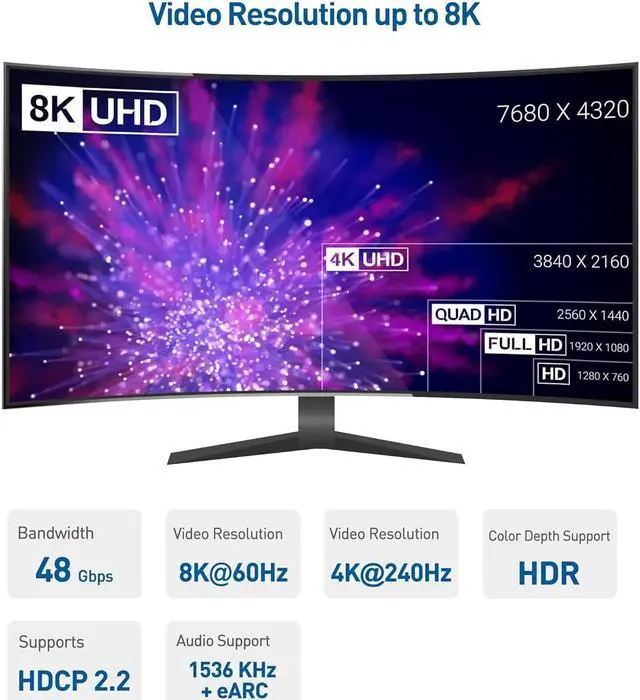8K HDMI cable supports high bandwidth HDR with a 48 Gbps bandwidth range; The 8K HDMI cord offers more than 2x the HDMI 2 and HDMI 2.0b bandwidth of existing 4K HDMI cable and HDMI 4K Ultra HD cable; HDCP 2.2 HDMI cable supports a 21:9 cinema aspect ratio, HDCP 2.2, 32 audio channels and a 1536 KHz sampling rate