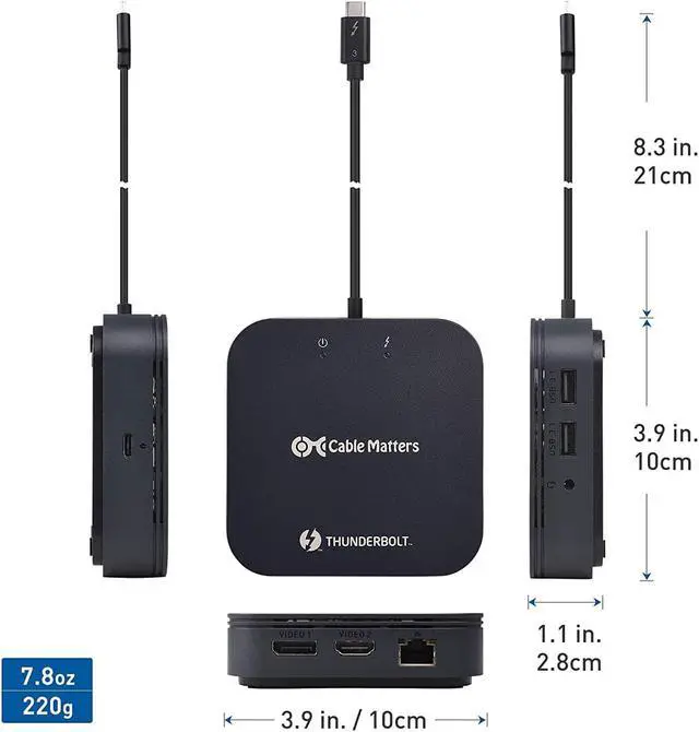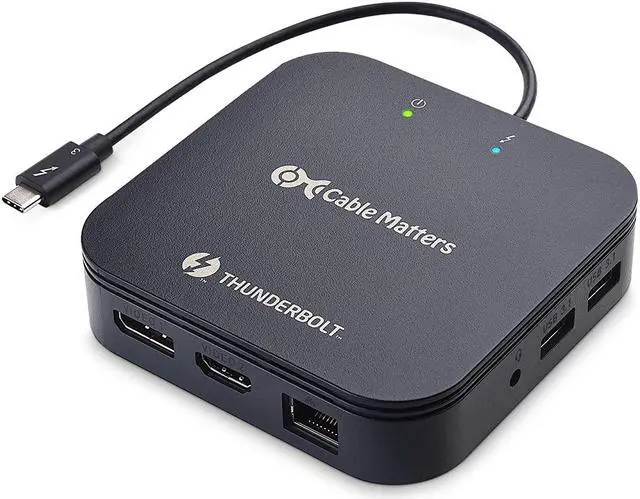 Give your Thunderbolt 3 device a big port expansion with this small form factor Thunderbolt 3 hub. Add 2 video ports, 2 USB-A ports, Gigabit Ethernet, audio, and pass-through charging to your Thunderbolt 3 device. Compatible with both Windows and Mac hosts with Thunderbolt 3 ports. The docking station is also compatible with USB4 and Thunderbolt 4 devices.