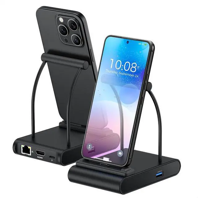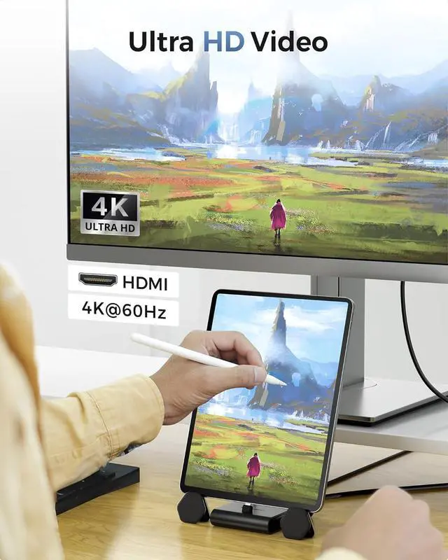 Connect an HDMI monitor to this USB C hub stand holder for smartphone and tablet to instantly turn your portable device into a full-feature computer; With video resolution support of up to 4K 60Hz, enjoy crisp visuals on an ultra-high resolution monitor