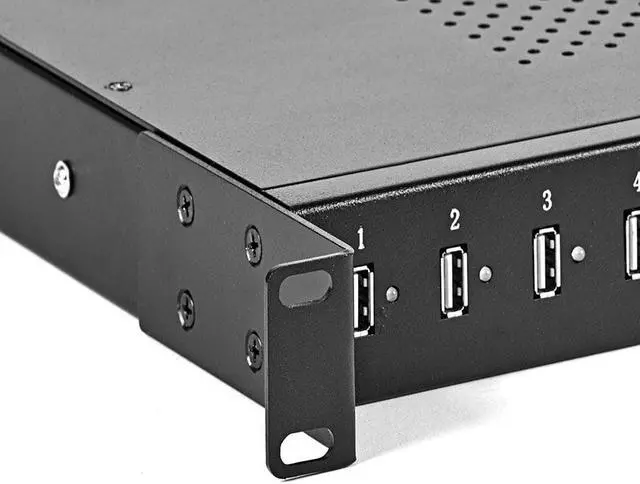 The USB charging hub station is designed to fit 2-port or 4-post racks, in a 1U space, and can be configured for a variety of applications in commercial and home environments. The 110 volt USB hub weighs 7.45 lbs and can also be placed and used on a flat surface. The unit is made from durable cold rolled steel with a black powder coated finish.