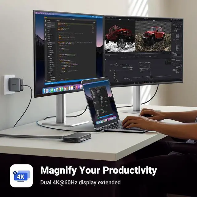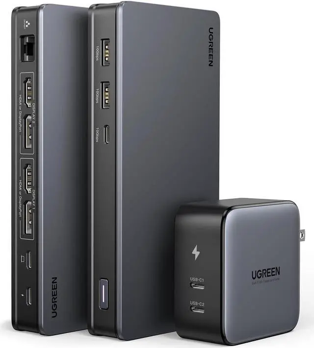 Package List: 1x 9-in-1 USB-C Docking Station, 1x 100W GaN Charger, 1x 100W Charging Cable, 1x USB C Cable, 1x User Manual. (Please don't use the charging cable (the braided one) to connect the docking station and host device, which will cause HDMI 2 port not to work. )