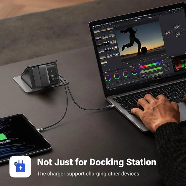 Fast Charging: With the PD 100W charging port and 100W GaN Charger included, the Macbook Docking Station supports up to 85W charging for laptops. It only takes 1.5 Hours to fully charge Macbook Pro 15'', and without taking up another port of the laptop.