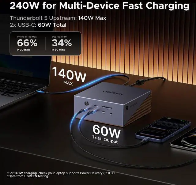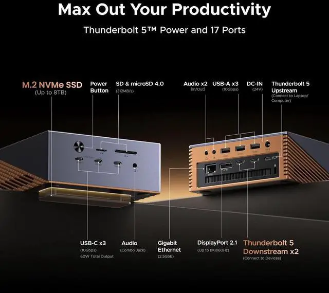 All-in-One Connectivity: Build a tidy workstation with 17 ports: 3×USB-A 10Gbps, 3×USB-C 10Gbps (2×60W charging), SD/TF 4.0, 3×3.5mm audio, 2.5G Ethernet, DP1.4, and 2×Thunderbolt 5 downstream ports.