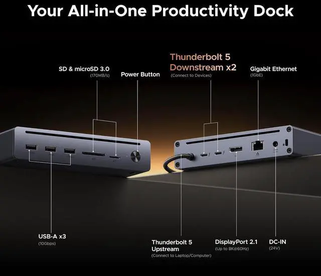 10-in-1 Essential Connectivity : Equipped with 3× 10Gbps USB-A, SD/TF 3.0 dual card reader, Gigabit Ethernet, DP2.1, and 2× TBT5 downstreamcovers all daily peripheral, networking, and display needs.