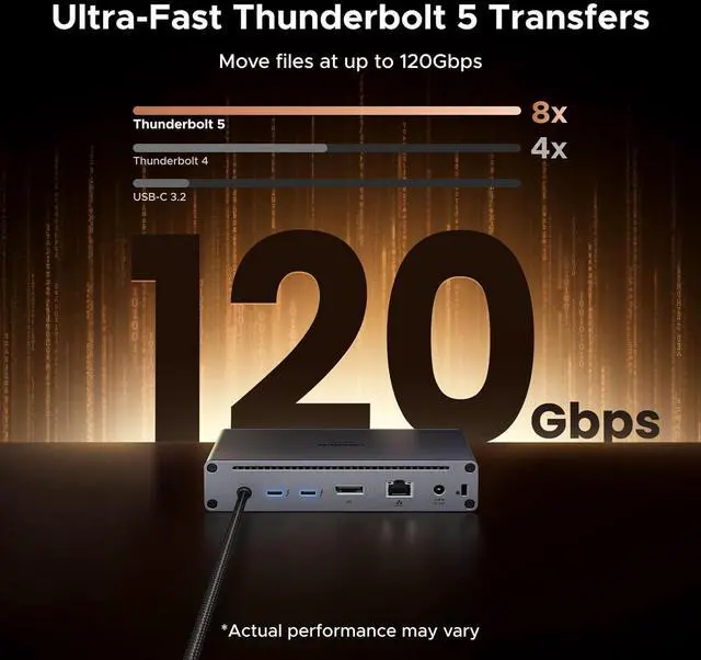 120Gbps Thunderbolt 5 Speed: Intel-certified Thunderbolt 5 reaches 120Gbps uni-directional/80Gbps bi-directional speed, transferring a 6GB 4K video in about 1 second. Backward compatible with Thunderbolt 4/3 and USB4.