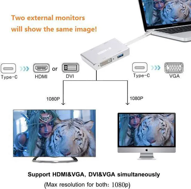 USB C to HDMI/DVI/VGA Adapter provides an easy and cost-effective solution to connect a USB C equipped notebook or desktop to HDMI, VGA or DVI enabled monitor or projector for high-definition video streaming. Extend your working desktop with mirroring or extending display to enhance work efficiency. Sync image with two displays to gives you a convenient visual enjoyment. Ideal for office, conference, home theater entertainment!