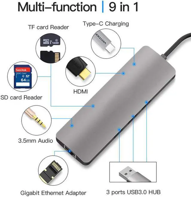 9 IN 1 GREAT EXPANSION: 3 x USB 3.0 Port, 2 x TF/SD Card Slot, 1 x HDMI 4K@30Hz, 1 x RJ45 1000M Ethernet port, 1 x USB C power delivery PD 2.0 Port, 1x 3.5mm line-in Port. Allow you to quickly upload and download photos, videos, music and other files. Connect to your external storage, keyboard, mouse, headset, optical drive.