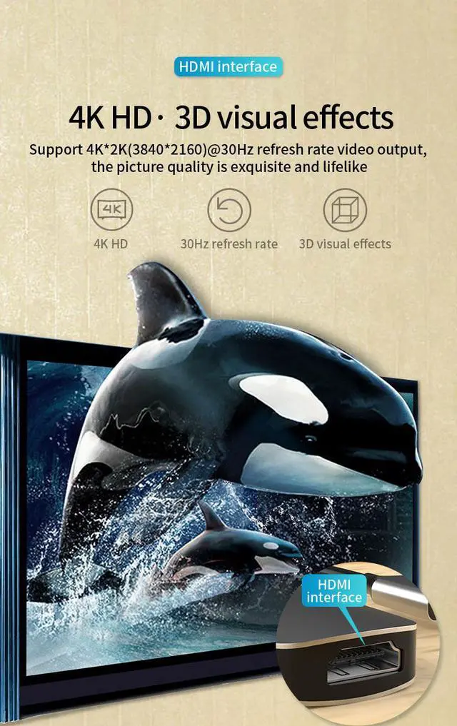 4-in-1 Type-C Hub: 1 x 4K HDMI-compatible Video Output(4K*2K 3840*2160@30Hz 1080P@60hz); 1 x USB3.0 High-speed data port(Up to 5Gbps); 1 x USB2.0 High-speed data port(Up to 480Mbps); 1 x USB-C PD Support 5V 2A (Maximum power output: 60W)