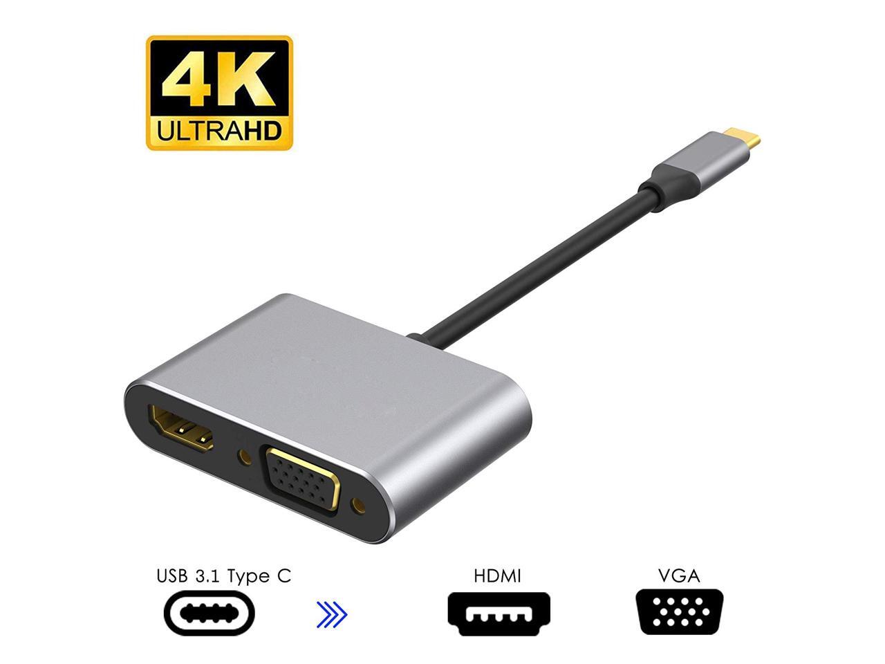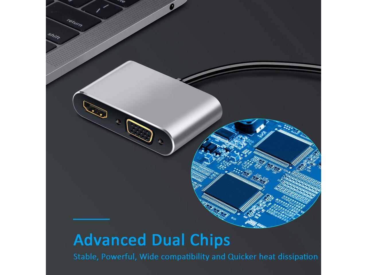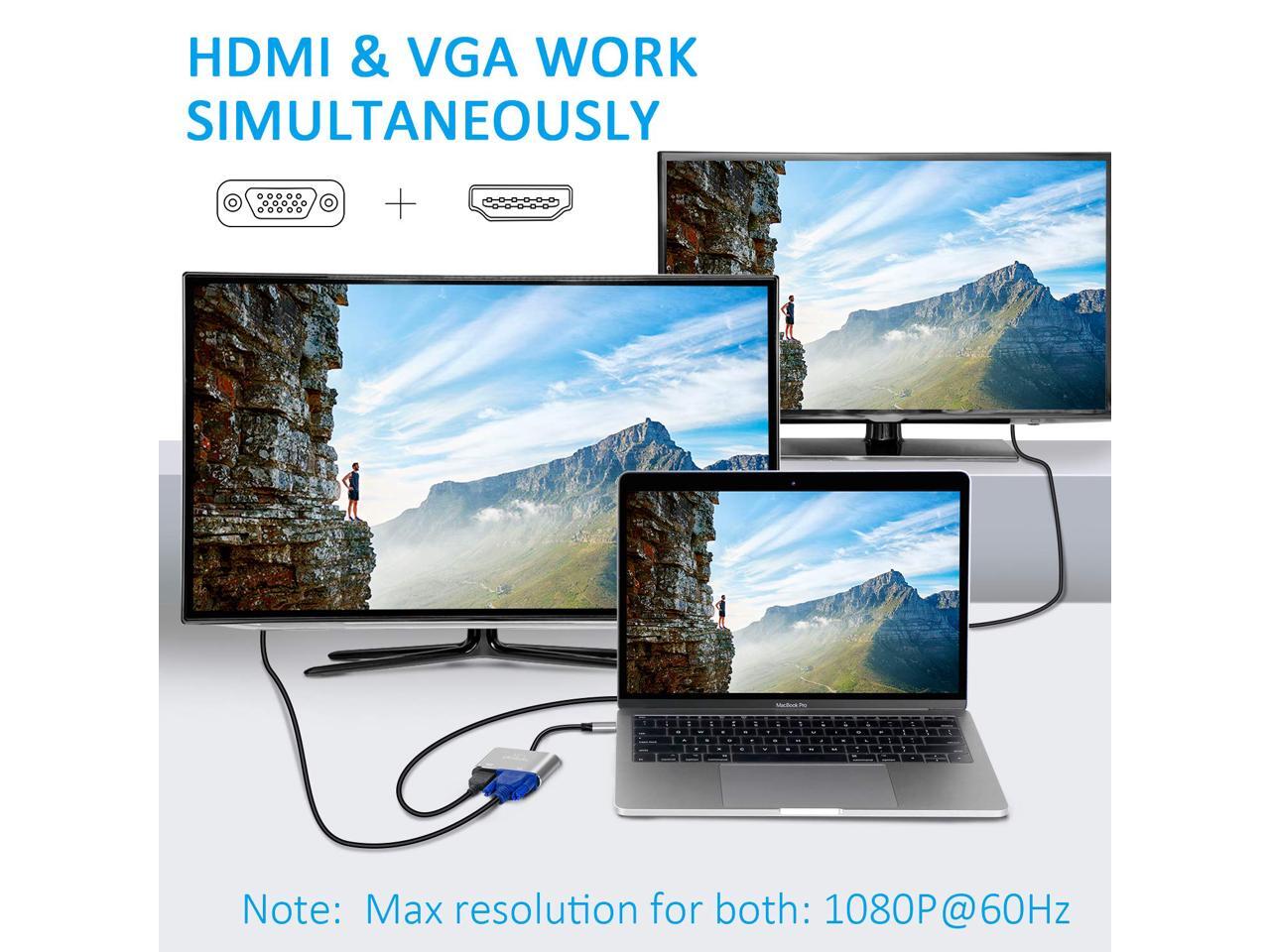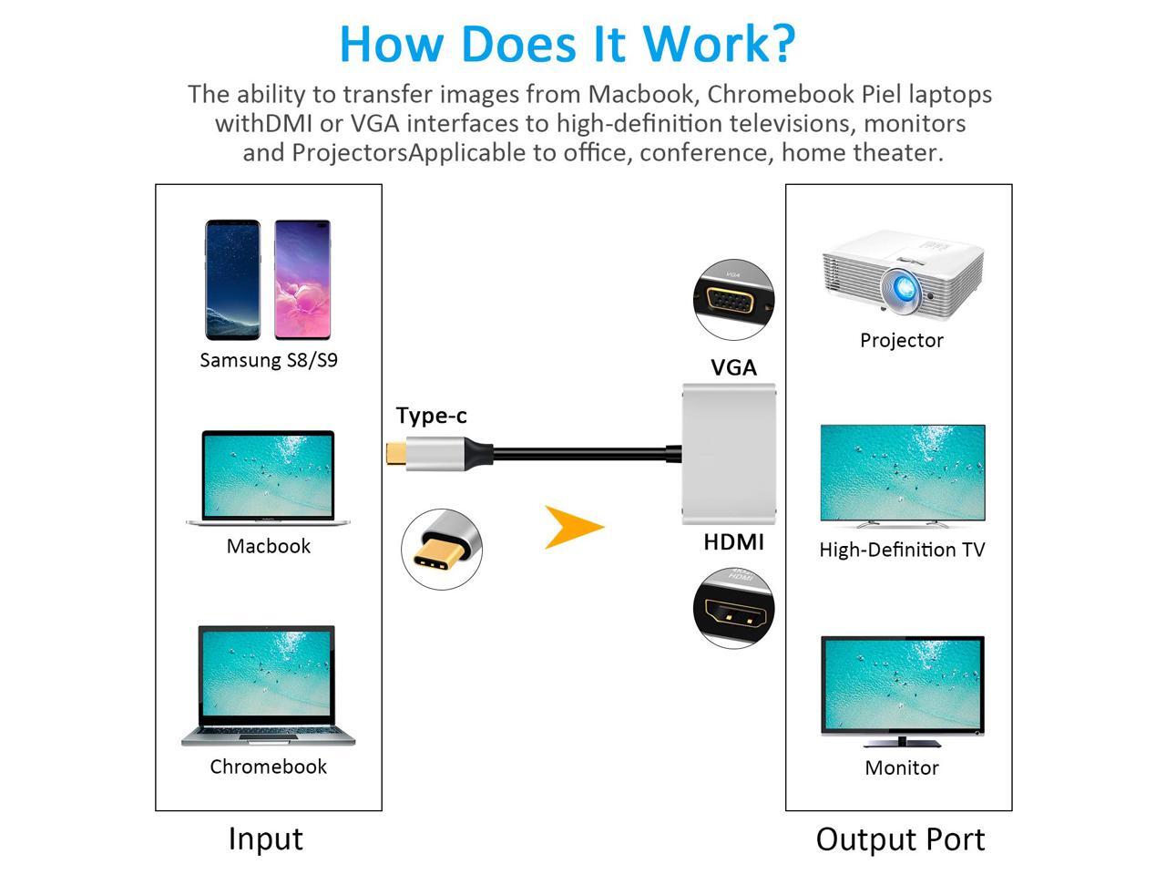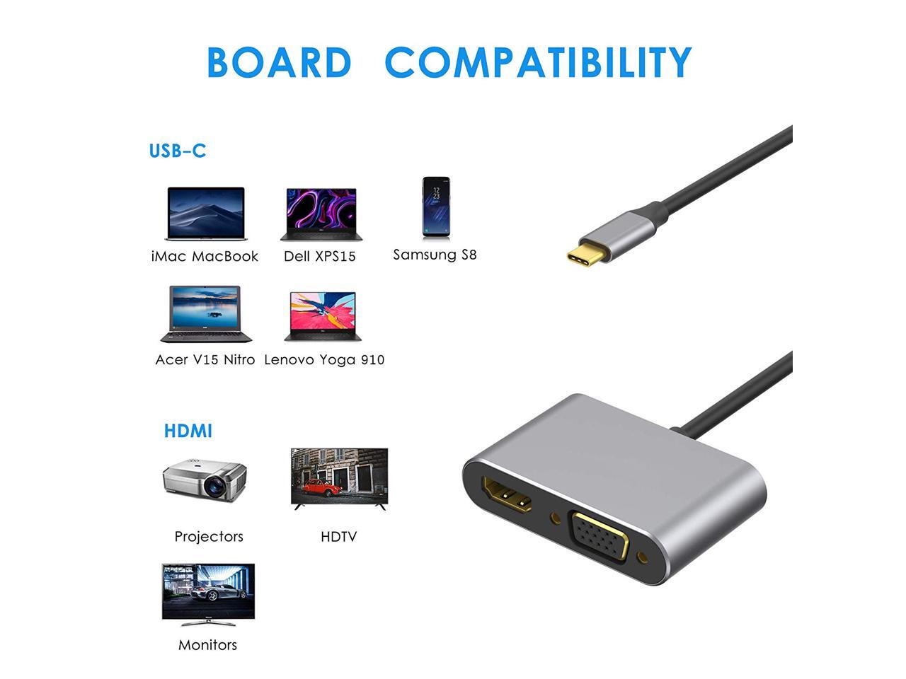 - Dual Output,Work Simultaneously: USB C to HDMI VGA Adapter with HDMI and VGA port can work at the same time. Audio and Video signals from a PC equipped with a USB Type-C terminal can be output simultaneously to a display, TV, projector etc. equipped with HDMI or VGA input terminal.