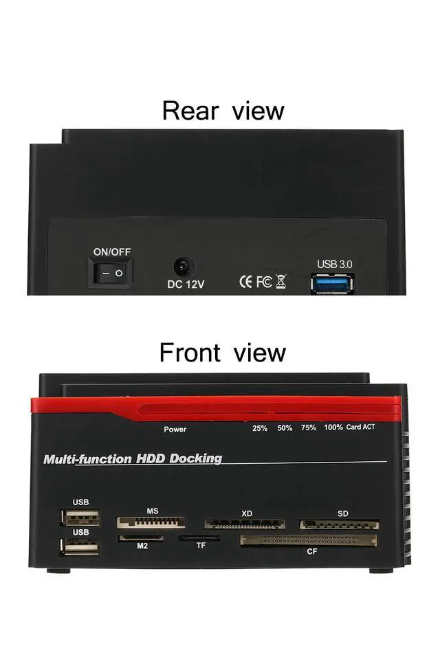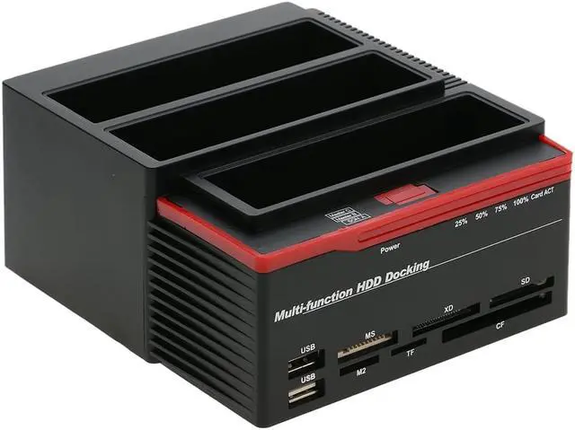 Tool free installation, no driver needed, plug and play, support hot plug. It features 6 slots for multiple memory cards(for SD/MMC/MS cards, TF card, CF card, M2 card etc. ), up to 32G cards supported, easy and quick access to multimedia files. LED indicator shows the read and write status of hard disk and power supply, clear and convenient. Multi-card slot HDD Case