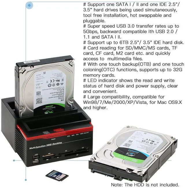 External HDD Hard Drive Easily and quickly transfer files from HD to PC or card readers, all-in-one HDD docking with one touch backup (OTB) and one touch cloning (OTC). Hot swappable and pluggable for most operation systems (Win98/7/8/10/Me/2000/XP/Vista, for Mac9. X and higher)