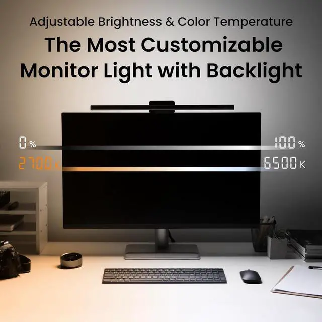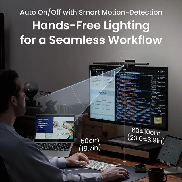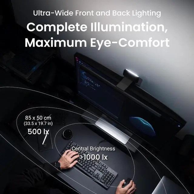 GLARE-FREE FRONT LIGHT (ASYM-Light Technology): Precision front lighting at an 18° anti-glare angle illuminates your desk without reflecting on your screen or shining into your eyes, perfect for any monitor setup.