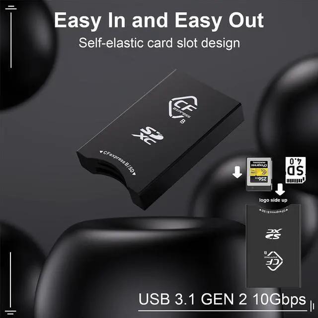 Read Professional CFexpress Type B/SD Cards SimultaneouslyUSB 3.2 Gen 2 CFexpress Type B and SD memory reader transfers your data at lightning speed - up to 1.25GB/s (10Gb/s) from both cards simultaneously.Transfer your masterpieces to your laptop in just a few seconds, CF express cards type b reader no need to wait for a long time