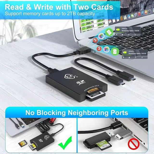 CFexpress Reader & USB A to USB C/USB C to USB C CableProfessional CFexpress and SD Card Reader comes with USB A to USB C cable and USB C to USB C cable, designed to allow one card reader to compatible with all variety MacBook Pro, Mac Air, computer, PC, laptop and other type-c devices. NOTE:The host must support USB 3.1 Gen 2 or USB 3.2 USB C port for the best performance;
