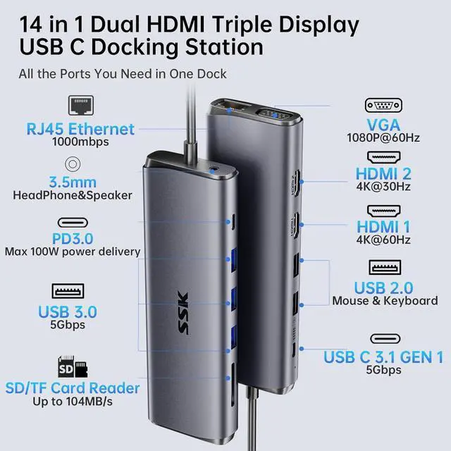 14 in 1 USB C Multiport Adapter, meet all your needs:SSK 14 in 1 USB C Laptop Docking Station, equipped with 2*4K HDMI ports and 1 VGA port, has triple monitor display,5 USBs,3 of which are USB 3.0 port, transfer speed of up to 5Gbps,2 are USB 2.0 port to facilitate your use of mouse and keyboard,1*100W PD3.0 type C fast charging port,1 USB C 3.1 Gen1 data port,3.5mm Audio/Mic,1000mbps RJ45 ethernet and SD/TF card reader,reading speed up to 104mbps,which can read SD and TF card at the same time