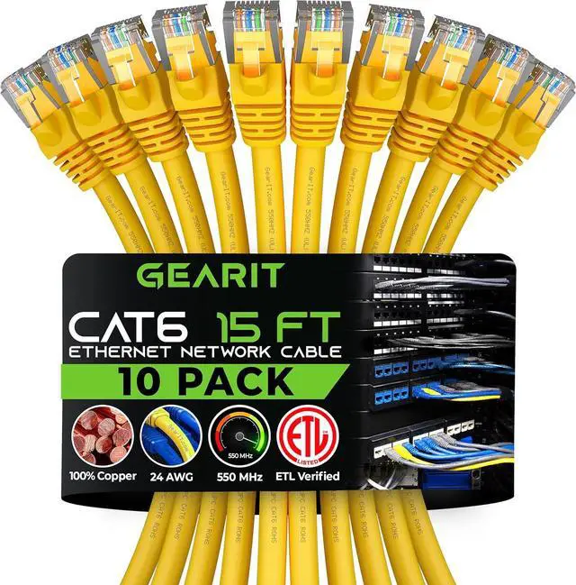 GEARit Cat 6 Ethernet Cable (10-Pack 15 Feet) Cat6 Network Patch, 10Gbps, RJ45, Snagless Cord, Gold-Plated Connectors, Internet for PC, TV, Tablet, Router, Printer, Servers, IT Data Center - Yellow
