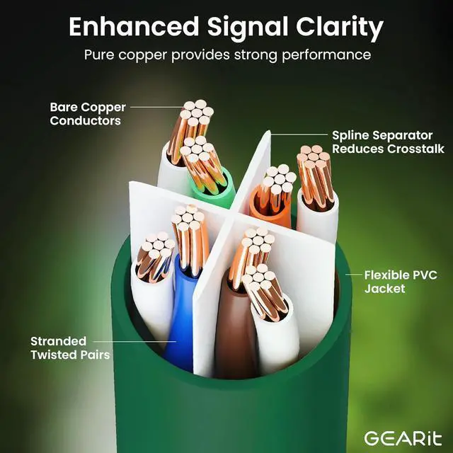 UTP 24AWG stranded conductors for flexibility, twisted in pairs and nested in a spline to minimize crosstalk, 50 micron gold-plated contacts for high-speed data transfer and corrosion resistance