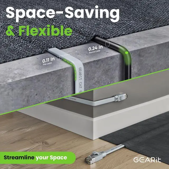 Space-Saving & Flexible - Our FLAT RJ45 cable is tailored for high-density environments, offering the flexibility and space-saving benefits of a flat cord design. Perfect for discreet installations, it effortlessly runs along walls, edges, corners, and underneath rugs or carpets for seamless concealment. Say goodbye to kinks and tangled cords with this versatile solution.