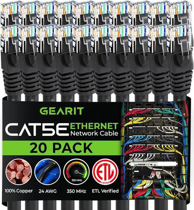 GearIt 20-Pack, Cat5e Ethernet Patch Cable 6 Feet - Snagless RJ45 Computer LAN Network Cord, Black