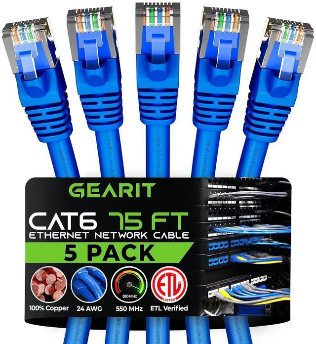 High-Performance Cat 6 Ethernet Cable Pack GEARit's 5-pack of 75 ft Cat6 ethernet patch cables features 24 AWG UTP stranded conductors twisted in an X-structure spline to minimize crosstalk and deliver full 10 Gbps bandwidth - future-proof network cables for home, office, data-center, and server use.