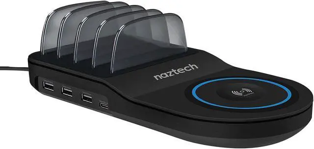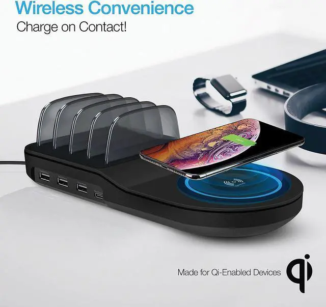4 high-speed USB ports: 3 USB and 1 USB-C. 8 in. x 4.72 in. x 3.3 in.. 7.5 watt/10 watt iPhone and Android fast charge compatible. Plug and play. AC cord length: 5 ft.. Limited lifetime warranty. Comptaible with USB-C, micro USB, and Lightning devices. Individual docking stations. Sleek, compact, and travel friendly. AC input: 100 volt/240 volt, 50 Hz/60 Hz. Total output: 35 watts/7 amps maximum. Qi output: 5 watts/7.5 watts/10 watts. USB output: 4x 5 volt/2.4 amp. Protection: short circuit/overcharge. Charge 5 devices simultaneously. Made for Qi enabled devices. Adaptive wireless charging technology. IntelliQ smart chip technology. Individual docking stations. Black. ⚠ WARNING: Cancer and Reproductive Harm - www.P65Warnings.ca.gov.