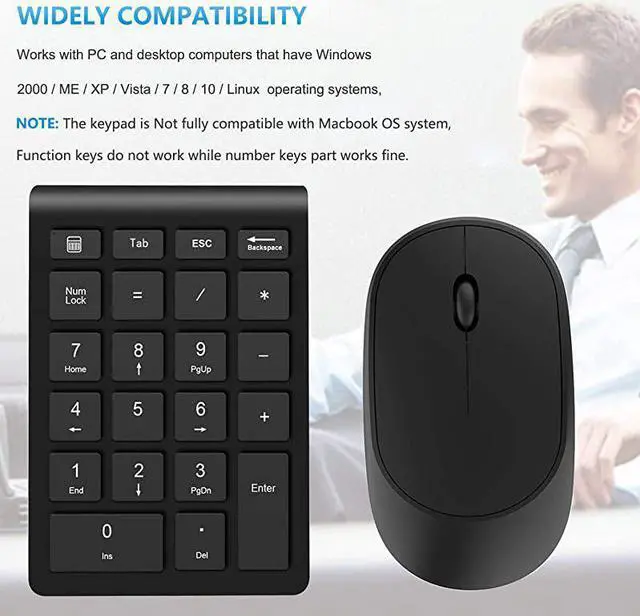***** ********** ***** ***** *****Best Quality Guranteed. ***** ***** LIFETIME RISK-FREE WARRANTY --- We promise a Life-time Money Back or Free New Replacement guarantee if you received defective products or have any questions with this wireless keypad and mouse combo***** ***** PLUG & PLAY SUPER EASY TO USE --- The wireless number pad and mouse combo use latest 2.4GH z wireless technology, just Plug and PlayNo drivers need to be installed. Mouse & Numpad share ONE USB receiver. Do not occupy other USB port. The USB Receiver is inserted in the battery compartment of the numeric keypad***** ***** COMFORTABLE & MULTI-FUNCTION WIRELESS NUMBER PAD --- Advanced scissor-switch construction keys offer a quiet tactile response.
