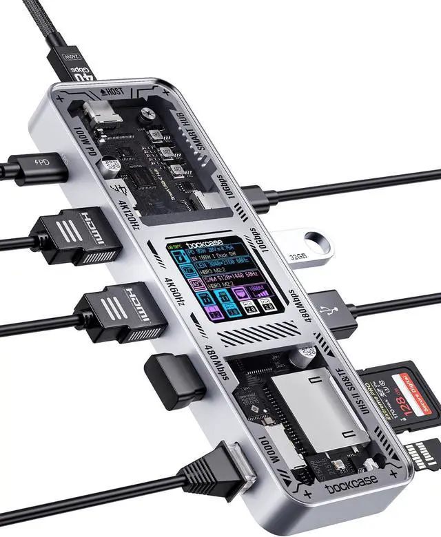 Dockcase Smart USB-C Hub: 10-in-1 Explorer Edition is the ideal hub for your workspace. With its customizable display and multiple ports, it effortlessly transforms your laptop or desktop into a fully equipped workstation