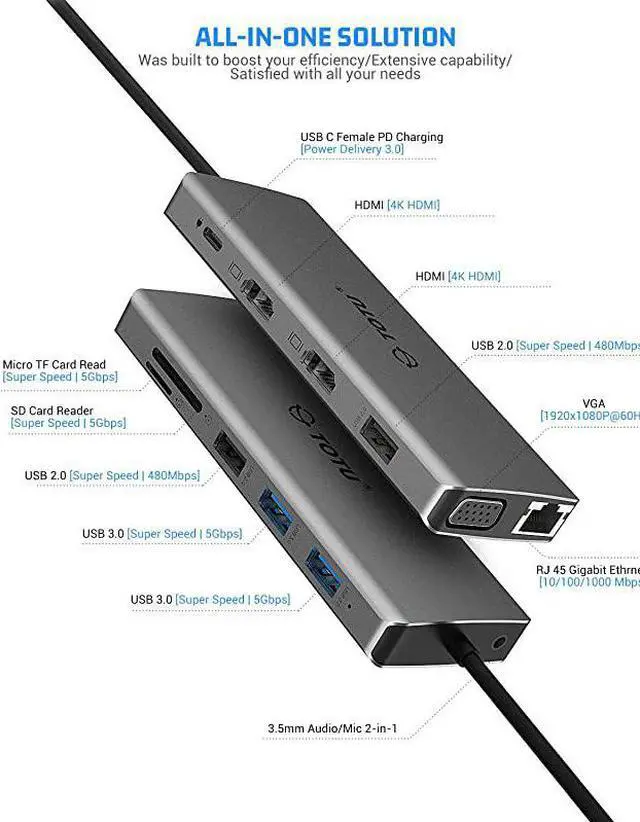 Screen switch shortcut key: Windows+P. 2. We do not recommend adding an extra extension cable for the hub as it can cause slow transmission, HDMI port not being recognized, or other connective issues. Not intended for use with gaming devices and high-power devices. (external hard drives, iPad, etc. ) 3. The USB ports are intended for data transfer. They only provide minimal 0.5A charging. 4. DO NOT support replication or extended displays when connecting the gaming device. 5. The max resolution of VGA and HDMI simultaneous output is 1080P. The max resolution of two HDMI simultaneous output is 4K UHD. 6. All of our products do not support USB C Female to USB Male Adapter and Express 4X to USB 3.1 Gen 2 (10 Gbps) 2-Port Type C Expansion Card Asmedia Chipset for Windows/Linux Kernel, since the converter will cause our hub lose all functions. 7. We would like to suggest you plug you wireless keyboard/mouse to USB 2.0 port.
