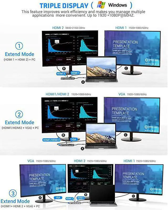 Triple Display: One display of HDMI 1 output, one display of HDMI2, one display of VGA, the laptop screen is black. Only Windows support MST, Mac OS DOSE NOT support.