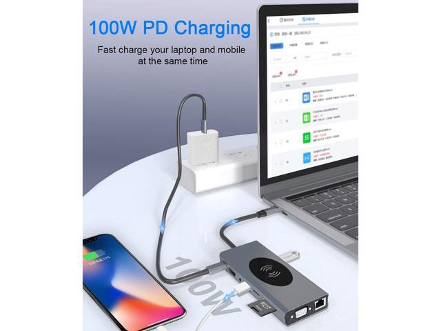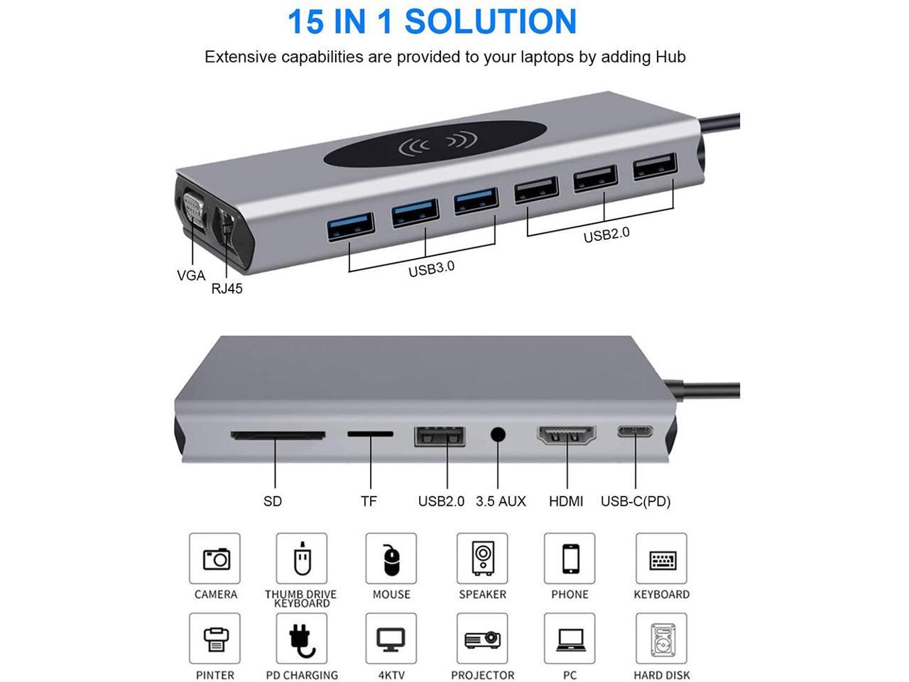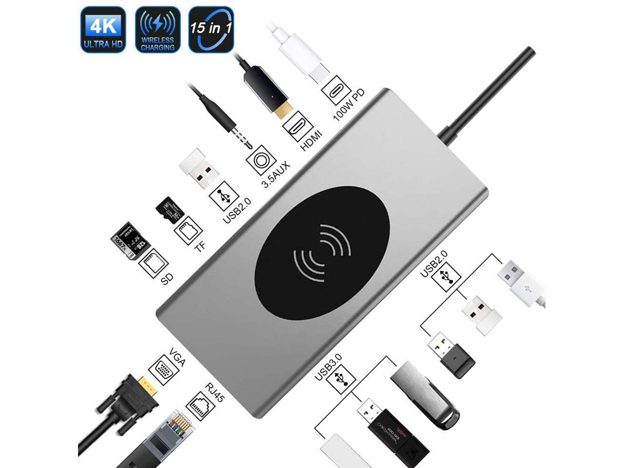 - 15 IN 1 USB C ADAPTER : Expand your USB-C device's capabilities like Apple Macbook to achieve different usage requirements and brings convenience to your daily life and work. It including 4K HDMI, Ethernet, VGA, Wireless charging, USB 3.0, USB 2.0, SD/TF card, 3.5mm Audio, and 100W PD (type C) output.