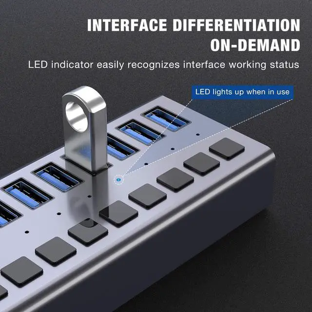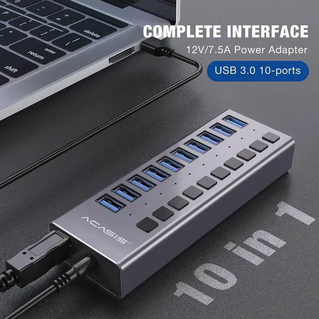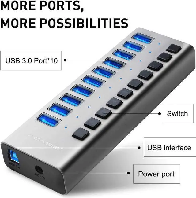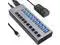 Powered USB Hub with 10 individual on/off switches for each USB port, helps saving the trouble of unplugging devices whenever you dont need it.