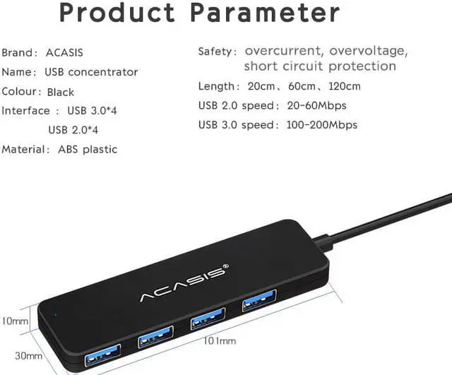 Classic design, stay outside persistent power supply, support hot swap, low power consumption. Suitable for U disk, reader, USB mouse, USB keyboard, scanner, digital camera, digital video camera, USB sound card, hard disk and other computer peripheral devices. Expand 4-port USB, each port power supply up to 500mA, using 2 generations of USB hub controller, no driver, plug and play, all using first-class high-quality electronic devices, ensure the stability of the product.
