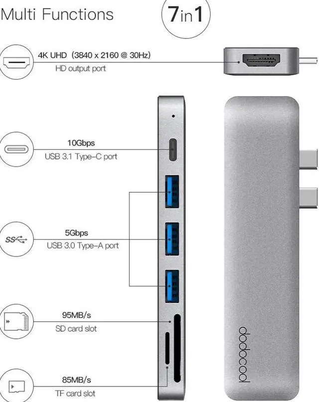 Add three additional USB-A 3.0 ports to your USB-C devices for syncing or connecting with USB-A devices and peripherals (eg. flash drives, keyboards, mice). Transfer at maximum 5 Gbps, up to 10 times faster than USB 2.0.