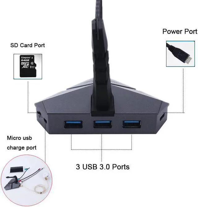 3.It's comes with 3 usb 3.0 port , 1 micro usb power input port , and 1 micro sd card port .support charging and transmission .